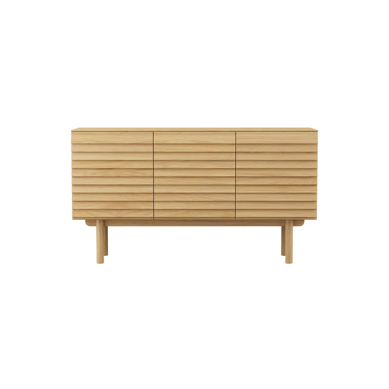 Skjenken er designet med tre tredører – alle med trestruktur som gir lamelleffekten. Bak døren lengst til venstre er det et lite rom med en trehylle. De to dørene til høyre skjuler et større rom uten inndeling, men med én trehylle. Begge hyllene er justerbare.