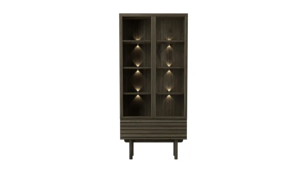 Vitrineskapet er utstyrt med to store glassdører som åpnes med push open. Under finnes en treskuff med treutfresing som gir persienneeffekt. Bak dørene er det tre trehyller som alle kan justeres og er klargjort for belysning, selv om lys ikke er inkludert.