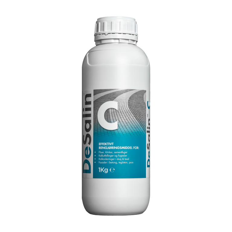 DeSalin C er et spesial renseprodukt til flis og fug, betong m.m. basert på naturlig konsentrert organisk syre. Produktet er både lett og hyggelig å jobbe med. Kan brukes både ute og inne. Produktet innehar en effektiv formulering for fjerning av blant annet fugeslør, sementslør og kalkslør på fliser betong, tegl og andre mineralske underlag. Løser effektivt opp salt/kalk slør som ofte kommer ut på betong og teglfasader. Meget effektiv til periodisk grovrengjøring av flis og fug. Møkkete fuger blir gjerne som nye igjen. Nedvasket område skylles eller moppes godt med vann. Ved større salt/kalkutfellinger og betongrester samt rust benyttes DeSalin K syre. DeSalin C fjerner også effektivt mugg. Passer meget godt ifbm næringsproduksjon siden rester av produktet ikke forblir igjen på overflaten etter nedvask/skylling. Lett biologisk nedbrytbart uten organiske tensider.