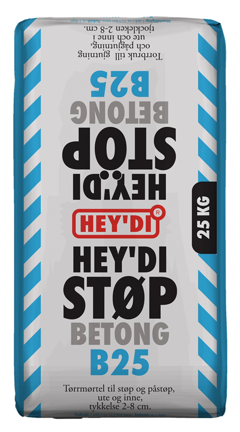 Heydi Støp B25 er laget av sement og velgradert sand. Heydi Støp B25 benyttes til støpearbeider inne og ute, og legges ut i lagtykkelser mellom 2 og 8 cm. Ved lagtykkelse utover 8 cm kan det tilsettes inntil 30% pukk.