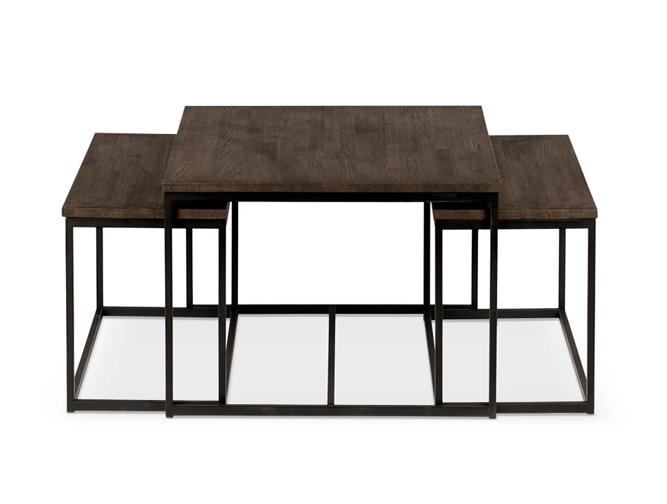 Kungälv sofabord/settebord er et sett med tre bord i røykfarget oljet massiv eik med ben i svart metall – en perfekt kombinasjon av naturlig varme og moderne uttrykk.
