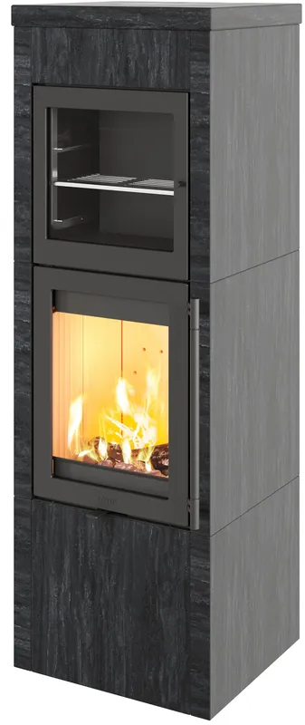 Ovnens robuste konstruksjon med støpejernsdører, Thermotte i vedkammeret, 5 cm tykk stein og Power Stones inkludert, sørger for utmerket varmelagring og langvarig varme med sin vekt på hele 500kg. Ovnens effektive fyringsteknikk minimerer aske, samtidig som den sørger for en jevn, behagelig temperatur i timevis etter at ilden har slukket. Døren har selvfølgelig det unikte soft-close-systemet til Lotus.