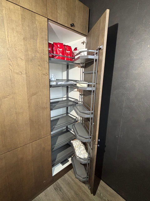Dette skapet med uttrekk gir enkel oversikt og tilgang til tørre varer. Med praktisk design blir det lettere å holde orden, samtidig som du sparer tid i kjøkkenet.