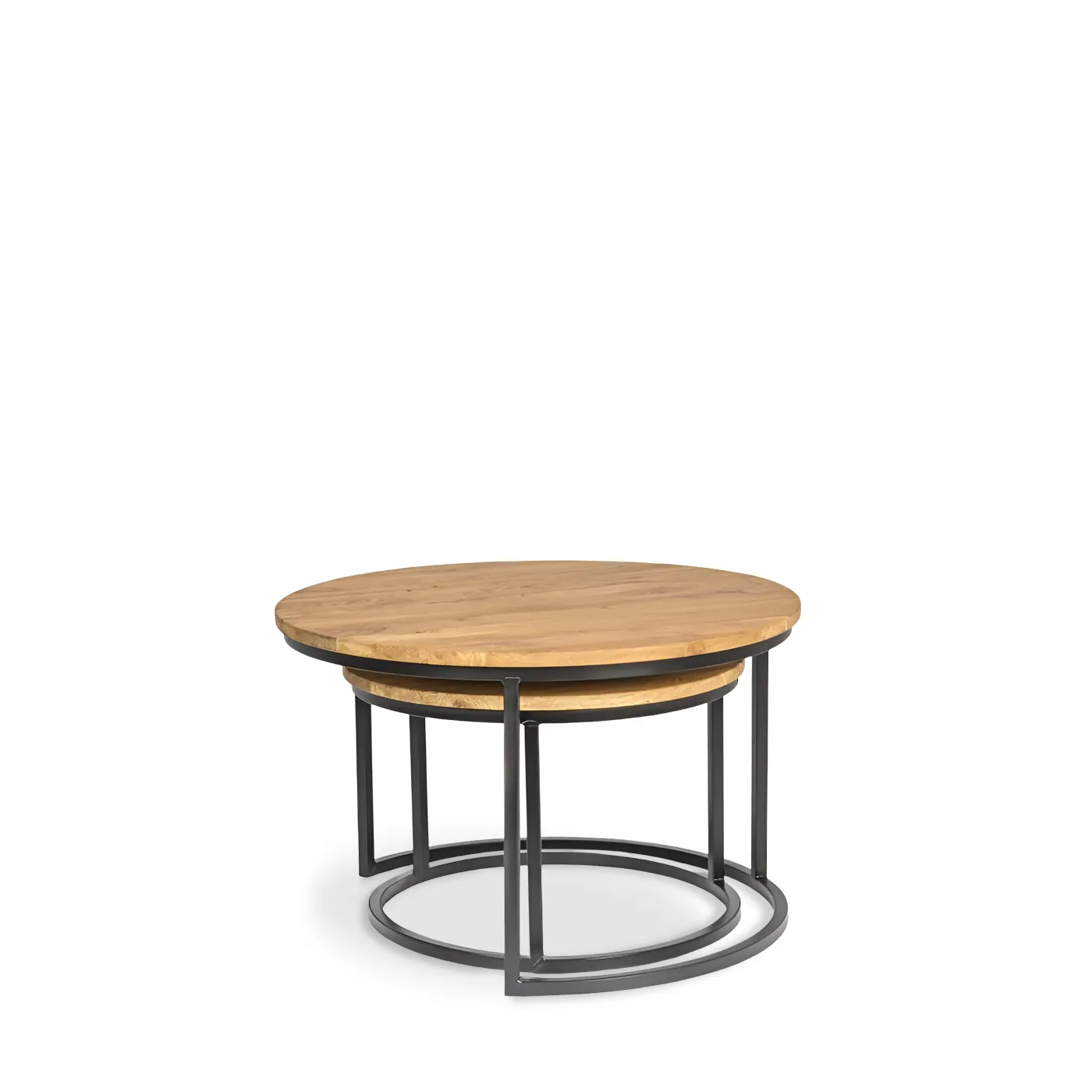 Newport salongbord er et praktisk satsbord med to bord i massiv oljet eik og ben i svart metall.