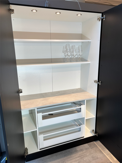 Bak to skapdører skjuler det seg en praktisk kaffibenk som gir deg et ryddig og funksjonelt område til kaffebrygging eller andre småoppgaver. En elegant løsning som gjør kjøkkenet både stilrent og effektivt