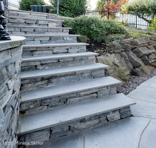 Med skifer gjør du trappen til et smykke i hjemmet eller hagen din. Bruk trinn av Oppdalskifer til å skape oppsiktsvekkende vakre overganger mellom etasjer, rom eller soner.